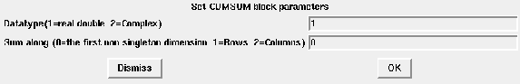 When the "Sum along" parameter is set to "0", the block sums across the first non singleton dimension. The result will be displayed as one element. This block is equivalent to cumsum in scilab.