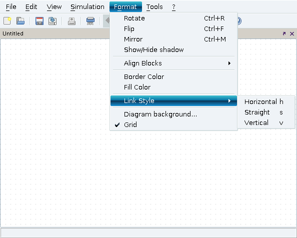 To delete blocks or a links, select first the Delete menu item, then click successively on the selected objects (with left button). When you delete a block all links connected to it are deleted as well.